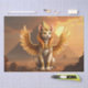 Mystical Winged Cat Sphinx – Egyptian Fantasy Art. A majestic cat-like sphinx with golden wings sits gracefully in a desert landscape, framed by pyramids and a glowing sunset sky. Adorned with ancient Egyptian jewellery and a royal headdress, this mystical guardian radiates serenity and divine power. This artwork blends Egyptian mythology, fantasy, and feline elegance – perfect for cat lovers, mythology fans, and those who enjoy magical and spiritual art.