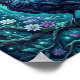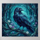 This mystical poster features a blue raven with glowing eyes perched in an enchanted moonlit forest, surrounded by swirling magic, flowers, and twisted trees. Finished in a oil acrylic painterly style.