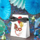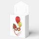 Tent-style with black ribbon favour box with a cabaret image, on the front and back, of a red and gold mask and a red and gold balloon. See the entire Cancan Favour Box collection in the PARTY FAVORS section.