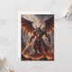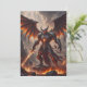This captivating image features a powerful demonic figure standing in a fiery landscape. The figure boasts large, bat-like wings engulfed in flames and is clad in dark, spiked armour. Its glowing red eyes and menacing expression, complete with large, curved horns, add to its formidable presence. Holding a flaming sword in its right hand, the demon exudes power, with its chest glowing as if fuelled by an internal fire. The dramatic background of a stormy sky, lightning, and gothic-style buildings enhances the intense and epic atmosphere of the scene, making this artwork a striking depiction of a mythical creature in a moment of dominance.