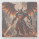 This captivating image features a powerful demonic figure standing in a fiery landscape. The figure boasts large, bat-like wings engulfed in flames and is clad in dark, spiked armour. Its glowing red eyes and menacing expression, complete with large, curved horns, add to its formidable presence. Holding a flaming sword in its right hand, the demon exudes power, with its chest glowing as if fuelled by an internal fire. The dramatic background of a stormy sky, lightning, and gothic-style buildings enhances the intense and epic atmosphere of the scene, making this artwork a striking depiction of a mythical creature in a moment of dominance.