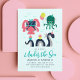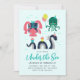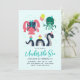 Cute and colourful birthday invitation for a toddler or young child featuring adorable illustrations of a loch ness, kraken and giant squid having a party. Perfect for girl or boy birthday.