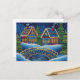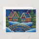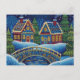 Cheerful naive art Christmas scene with cozy houses decorated in festive lights, snow-covered rooftops, and Christmas trees adorned with ornaments, set around a charming arched bridge crossing a gently flowing stream, all blanketed in soft, glistening snow.