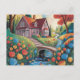 A vibrant naive art scene with a grand house nestled in rolling hills, vivid blue, orange, and yellow flowers blooming in the background, tall trees surrounding a graceful stone bridge over a gently flowing stream, all beneath a swirling mosaic-style sky full of motion and color.