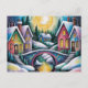 A delightful naive art village blanketed in snow, where a stone-colored bridge arches over a gently flowing stream, steps winding upward to rows of vivid, colorful houses, with tall snowy trees surrounding the scene and dappled sunlight softly glowing across rooftops and paths.