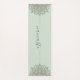 A modern attractive pastel blue green yoga mat with flowery mandala universe symbol, and a trendy script typeface namaste; for your yoga practice students or your everyday exercise routine! Modern stylish design.