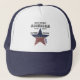 This classic navy blue and white Trucker Hat features a star cutout with blue background and stars on the top half and horizontal red stripes pattern on the bottom, painted on rustic distressed wood for a vintage look, and black text in various fonts and sizes. Easily change or remove the diagonal name using the Template provided. (To edit and change/remove font style-color-size and more-- use the Design Tool.) Choose from 12 solid and combination colors and other style hats, including the popular bucket hat. 100% nylon mesh back keeps you cool. Adjustable from 17" to 24". See "About" this product for more information and care. Happy Birthday America, 1776-2026, 250 Years Freedom. Flag Star