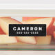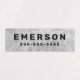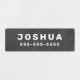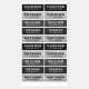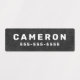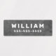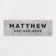 Waterproof property labels with customisable name and telephone number on light to dark grey, rough cocrete backgrounds. Great for labelling your children's belongings