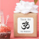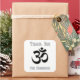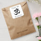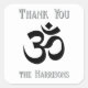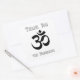 Square 3" solid black Om Symbol featuring 'Thank You' text and name in an elegant font, silver on a white background. Change or remove name & text using the Template provided. Six 3” stickers per sheet and also available is 20 smaller 1.5” stickers. See "About This Product" at side for more information.. HIGH reviews.
