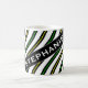 This mug design features a pattern of black, yellow and green wavy lines. It also features a customisable name in white coloured text within a dark coloured area, with both at an angle. [~Z0000051]