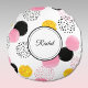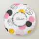 Abstract design with pink, dark grey, polka dots and gold motifs. This is a trendy round throw pillow ideal for meditation, yoga, desk chair, dorm room decor. Change the elegant script name to make it yours using the Template provided. The back is a solid dark gray taken from the front design. Dimensions are 16" diameter when flat and 14" stuffed. 100% brushed polyester is wrinkle free. Machine washable, able to retain color and resist shrinkage. Made in the USA. See "About" for information and care.