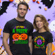 Celebrate Halloween and your upcoming joy with these matching couple birth announcement shirts. Front slogans playfully read 'It's Not A Trick' and 'We're Expecting a Little Treat.' Customise with your names and due date on the back for a festive and heartwarming announcement.