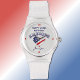 This sporty 80s style watch with durable clear silicone buckle strap features "Happy 250th Birthday America, heart shape rustic USA flag motif, handwritten name all in dark blue and small subtle numbers in red. These were called "Jelly watches" in the 80s. Easily change or remove the name using the Design Tool provided. White and black silicone straps are also available along with 15 other styles. See "About" for more information.