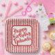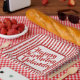 The geometric background is square with a red and white simple stripes pattern covered with confetti.