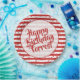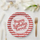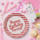 The trendy geometric pattern is a red and white simple stripes pattern with confetti. There is a white circle in the centre for your text and a text template so you can easily change it to your own words, name, or event.
