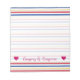This notepad design features stripes with colours inspired by the colours of an ice hockey arena rink. The blue is inspired by the rink's two blue lines, and the red by the centre red line. The yellow is inspired by the yellow kick plate at the bottom of the boards. The white/grey colours are inspired by the colours of the boards and the ice. It also features a custom name near the bottom, between heart shapes. [~Z0000006]