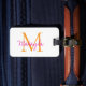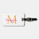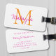 This elegant luggage tag features a stylish monogram and name in pink script and orange typography. It is easily customizable with your details on the back.