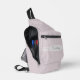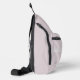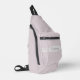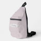 This sling bag features a pretty pale lavender purple scripted name on a pale pink grey Deco style band over a cool blush pink background.