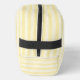 The aesthetic is defined by its classic yellow stripes, evoking the nostalgia of 1950s cabanas and summer styling. The focal point, however, is the custom embroidery or print. Your name is artfully arranged using a playful yet polished combination of flowing script and structured serif fonts, giving it a bespoke, boutique feel. Whether storing makeup, skincare, or travel essentials, this bag ensures you stay organized while looking effortlessly chic.