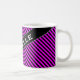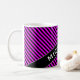 This mug design features a simple pattern of alternating black and fuchsia lines/stripes. It also features a customised name in white coloured text within a dark coloured area, with both at an angle. [~Z0000051]