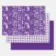 Typography wrapping paper that can be personalised name and age/number. Sheet 1 features a name word cloud in purple on a white background. Sheet two is white with a pattern of the number 50 In purple and sheet three is solid white. Make your give extra special with this wrapping paper design.
