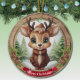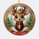 Name Whimsical Reindeer Rustic Holiday Tree ceramic ornament! Xmas Deer Antlered Animal Character decoration Featuring customizable white text saying "Merry Christmas" on a vibrant red ribbon – easily swap it out for a loved one's name to make it truly personal gift tag. Round framed, brown wooden style with charming accents of pine cones and evergreen branches for that cozy, woodland vibe. At the center is a cute, whimsical reindeer in cartoon graphic style, dressed in a brown coat and hat, evoking the spirit of wildlife with a festive twist. The background showcases an enchanting winter wonderland scene complete with a snow-dusted trees, capturing the joy of the winter season. This two-sided, personalizable decor ensures festive charm from every angle – the delightful illustration appears on both front and back, so it always looks complete no matter how it spins while hanging. Perfect for gifting or decorating, and you can transfer this unique design to a variety of other products, from mugs to cards and more! Personalize your pinecone decor and bring home this delightfully unique keepsake today – visit Zazzle to customize and order now!