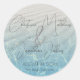 This romantic and elegant event or wedding sticker features the names of the couple printed across a sandy beach. The bottom portion has a water pattern that gently crosses over the white sand.