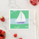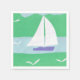 These cocktail napkins are designed with a paper art depiction of a white sailboat on a river next to green hills.