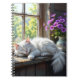 Add a relaxing vibe to your office or school supplies with this pretty colourful notebook featuring a white fluffy cat napping on a rustic window sill next to a pretty vase of vibrant purple flowers.