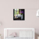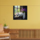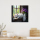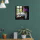 Add a relaxing vibe to your room with this pretty colourful poster featuring a white fluffy cat napping on a rustic window sill next to a pretty vase of vibrant purple flowers.