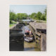 A photographic design of a canal narrowboat that has just entered the lock and waiting for the lock gates to close.
