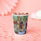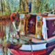 A pretty art design of a narrowboat moored in a peaceful part of the canal.