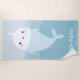 Beach towel featuring a cartoon illustration of a little happy narwhal in the sea among blue waves and your custom name.