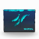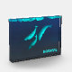 Features three narwhals, Monodon monoceros. Customisable text reading, NARWHAL" also appears. The narwhal is related to the Beluga whale and lives in the Arctic year-round. They are found primarily in the waters of Greenland and Canada rarely south of 65°N latitude. Males weigh up to 1,600 kilograms (3,500 lb), females weigh around 1,000 kilograms (2,200 lb). The largest narwhal ever found weighed 3,500 pounds. They are shaped like a beluga and have about four inches of insulating fat. Narwhals normally congregate in groups of about five to ten individuals. In the summer, several groups come together forming larger aggregations. Narwhal is derived from the Old Norse word nár, meaning “corpse”, referring to the animal’s greyish, mottled pigmentation, like that of a drowned sailor. Narwhal are darkest when young becoming whiter with age. The most conspicuous characteristic of the male narwhal is its single 2–3 metre (7–10 ft) long twisted tusk. It is an incisor tooth that projects from the left side of the upper jaw and forms a left-handed helix. The narwhal’s scientific name, Monodon monoceros, is derived from “one-tooth one-horn.” The tusk can be up to 3 metres (9.8 ft) long—compared with a body length of 4–5 metres (13–16 ft)—and weigh up to 10 kilograms (22 lb). About one in 500 males has two tusks, which occurs when the right incisor, normally small, also grows out. A female narwhal may also produce a tusk, but this occurs rarely, and there is a single recorded case of a female with dual tusks. This behaviour is thought to maintain social dominance hierarchies. At times, male narwhals rub their tusks together in an activity called “tusking.” The reason for this behaviour is unknown; it may be to “scratch an itch,” (the base of the tusk is usually infested with lice); or tusk crossing may be a friendly greeting. The most broadly accepted theory for the role of the tusk is similar to the mane of a lion or the tail feathers of a peacock. It may help determine social rank, maintain dominance hierarchies or help young males develop skills necessary for performance in adul roles. Narwhals have rarely been observed using their tusk for fighting or other aggressive behaviour or for breaking sea ice in their Arctic habitat. Narwhal usually proceed at a leisurely pace, slowly breathing and rolling, but are remarkably quick when they feel threatened. Sometimes they travel in small family groups and communicate by means of a great variety of squeals, trills, whistles, and clicks. Narwhals have a relatively restricted and specialised diet. Their prey is predominantly composed of Greenland halibut, polar and Arctic cod, shrimp and Gonatus squid. Additional items found in stomachs have included wolffish, capelin, skate eggs and sometimes rocks, accidentally ingested when whales feed near the bottom. How narwhal catch their prey is unknown. Some scientists believe narwhal stun their prey with sound as do dolphins . Narwhal exhibit seasonal migrations with high fidelity of return to preferred ice-free summering grounds, usually in shallow waters. In the winter, they are found primarily in offshore, deeper waters under thick pack ice, surfacing in narrow fissures in the sea ice, or leads. Narwhal from Canada and West Greenland winter regularly in the pack ice of Davis Strait and Baffin Bay along the continental slope with less than 5% open water and high densities of Greenland halibut. Feeding in the winter accounts for a much larger portion of narwhal energy intake than in the summer and, as marine predators, they are unique in their successful exploitation of deep-water arctic ecosystems. Most noteable of their adaptations is the ability to perform deep dives. When on their wintering grounds, the narwhals make some of the deepest dives ever recorded for a marine mammal, diving to at least 800 metres (2,400 feet) over 15 times per day with many dives reaching 1,500 metres (4,500 feet). Dives to these depths last around 25 minutes, including the time spent at the bottom and the transit down and back from the surface. In the shallower summering grounds, narwhals dive to depths between 30 and 300 metres (90–900 feet). The only predators of narwhals besides humans are polar bears and orcas. Inuit people are allowed to hunt this whale species legally for subsistence. The northern climate provides little nutrition in the form of vitamins which can only be obtained through the consumption of seal, whale, and walrus. Almost all parts of the narwhal, meat, skin, blubber and organs, are consumed. Mattak, the word for raw skin and blubber, is considered a delicacy, and the bones are used for tools and art. In some places in Greenland such as Qaanaaq, traditional hunting methods are used, and whales are harpooned from handmade kayaks. In other parts of Greenland and northern Canada high-speed boats and hunting rifles are used. While populations appear stable, the narwhal has been deemed particularly vulnerable to climate change due to a narrow geographical range and specialised diet. Narwhals that have been brought into captivity tend to die quickly. In Inuit legend the narwhal’s tusk was created when a woman with a harpoon rope tied around her waist was dragged into the ocean after the harpoon had struck a large narwhal. She was transformed into a narwhal herself, and her hair, that she was wearing in a twisted knot, became the characteristic spiral narwhal tusk. Some mediaeval Europeans believed narwhal tusks to be the horns from the legendary unicorn. As these horns were considered to have magic powers, such as the ability to cure poison and melancholia, Vikings and other northern traders were able to sell them for many times their weight in gold. The tusks were used to make cups that were thought to negate any poison that may have been slipped into the drink. During the 16th century, Queen Elizabeth received a carved and bejeweled narwhal tusk for £10,000—the cost of a