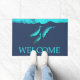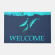 Features three narwhals swimming under the Arctic ice along with text reading, "WELCOME."