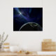 This artist's concept depicts the pulsar planet system discovered by Aleksander Wolszczan in 1992. Wolszczan used the Arecibo radio telescope in Puerto Rico to find three planets - the first of any kind ever found outside our solar system - circling a pulsar called PSR B1257+12. Pulsars are rapidly rotating neutron stars, which are the collapsed cores of exploded massive stars. They spin and pulse with radiation, much like a lighthouse beacon. Here, the pulsar's twisted magnetic fields are highlighted by the blue glow. All three pulsar planets are shown in this picture; the farthest two from the pulsar (closest in this view) are about the size of Earth. Radiation from charged pulsar particles would probably rain down on the planets, causing their night skies to light up with auroras similar to our Northern Lights. One such aurora is illustrated on the planet at the bottom of the picture. Since this landmark discovery, more than 160 extrasolar planets have been observed around stars that are burning nuclear fuel. The planets spotted by Wolszczan are still the only ones around a dead star. They also might be part of a second generation of planets, the first having been destroyed when their star blew up. The Spitzer Space Telescope's discovery of a dusty disk around a pulsar might represent the beginnings of a similarly "reborn" planetary system.