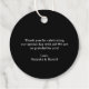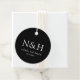 Modern wedding favour tags featuring a simple and minimal black design with your monogram in a bold font along with your names in an elegant handwriting script and your wedding date in a serif font. The back has your personalised thank you message.