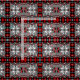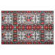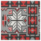 Adaptation of a traditional native American blanket weaving pattern in red, grey, white, and black. Design features eight sided snowflake like focal points framed by step pattern boxes.
