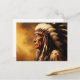 The painting depicts a Native American chief in profile, his face etched with wisdom and experience. He wears a traditional headdress adorned with feathers, beads, and a red band. His long, dark hair flows down his back, and his eyes gaze intently into the distance. The background is a warm, golden sunset sky, suggesting a sense of peace and tranquillity.
