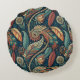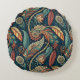 This semi-abstract ethnic pattern pillow features swirls of feathers, flowers, and paisley like shapes n dusty teal, terra cotta, rust, deep blue green, and cream. This vintage style print would fit a variety of decor colours and styles, with a pattern with bold swirls in muted tones. The design is the same on both sides of this round pillow, and it's available in multiple fabrics.
