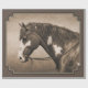 Beautifully painted portrait of a Native American chestnut pinto horse decorated with war paint symbols, feathers, and braided leather reins, in monochrome sepia tones to created an old or aged photo effect.