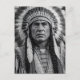 A black and white portrait of a A.I Generated Native American man wearing a traditional headdress with feathers.