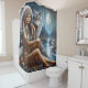 Amidst cascading water and lush greenery, a Native Indian woman adorned in traditional attire rests by a riverbank. Beside her, a majestic wolf gazes intently, embodying the deep connection between nature and spirit