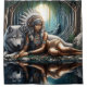 Beneath the soft glow of the morning sun, a Native Indian woman reclines peacefully by a tranquil stream, her loyal wolf companion by her side