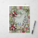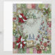 The design features a vibrant patchwork border of floral, damask, and plaid patterns in shades of green, red, and cream, with subtle gold accents. The soft, snowy center is framed by striking red and white poinsettias and lush foliage.