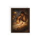 This postcard depicts a serene and humble moment in the stable, with the warm glow of a lantern illuminating Mary, Joseph and the newborn baby Jesus resting in the manger.