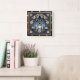 This square wall clock features a highly detailed, dimensional illustration of the Nativity scene centered within an elaborate border. The central motif, set against a dark blue background, shows Mary, Joseph, and the Baby Jesus in the manger, surrounded by other figures. Above them, the text "PEACE ON EARTH" is prominently displayed, flanked by two angels and two white doves. The entire circular scene is framed by a rich blue and gray floral wreath of white lilies and blue berries. The illustration is set within a wide, dark outer wood-look frame, which is simulated using high-detail artwork and is not real wood.