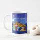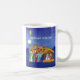 The three wise men stand in reverence, offering their gifts to the baby Jesus, who is cradled in Mary’s arms, with Joseph by her side. The humble manger scene is illuminated by a brilliant star in the night sky, symbolising the guiding light that led them there. Behind them, the town of Bethlehem rests quietly under a serene, starry sky, with a glowing white moon casting a peaceful light over the scene. The atmosphere is one of awe, peace, and the quiet wonder of the holy night.
