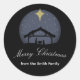 A nativity scene inside a small blue vignette—personalised family Christmas stickers to put on all your Christmas card envelopes and wrapped presents this year for family and friends. Babe in a manger, star of Bethlehem. Elegant script typography.