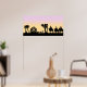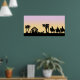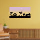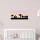This is a long, panoramic artwork of a sunset-hued sky over silhouettes of the Nativity. The images include the stable with the Baby Jesus, shepherds and the Wise Men approaching.